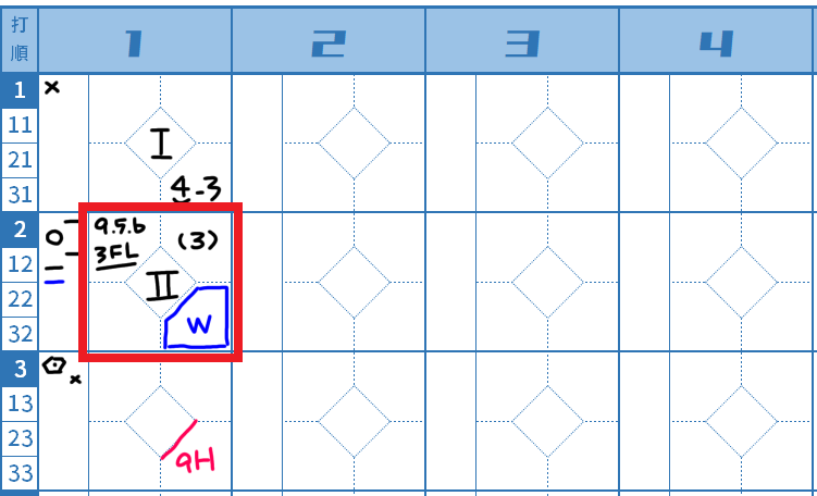 こうしたプレイが起きた場合、走者のリザルト欄には「3ft」もしくは「3FL (= Three Foot Lineの略)」として記載します。また、3という数字が一塁手を示すポジション記号である「3」と混乱する場合には、単に「ft」「FL」といった表記にしてもよいと思います。こうした際の記載ルールについては、スコアラーとして事前に監督やチーム内での共有事項として取り決めておくとよいでしょう。