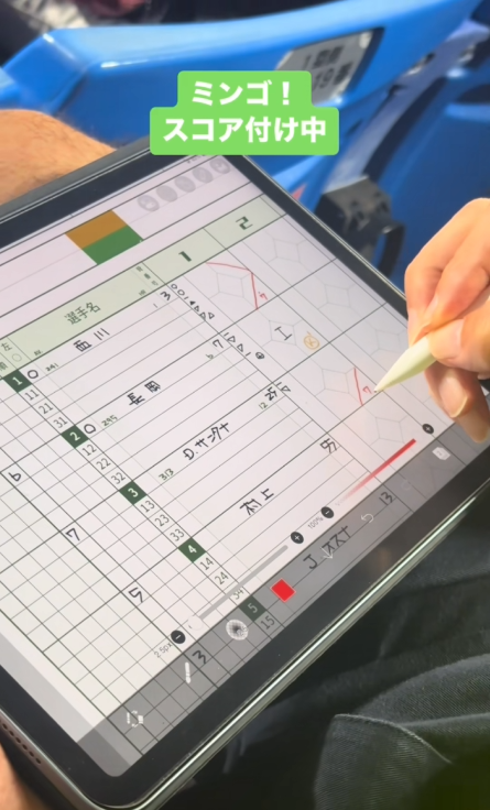 実際に神宮球場にて<スコアパッド>を付けてます!