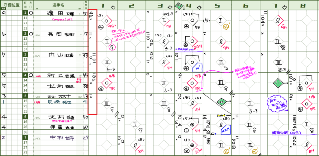 これだけの工夫ですが、バッテリーによる一球ごとの配球の考えや、打者がどちらの系統を狙い球にしているかが、スコアからでも透けて見えてくる面白さが感じられるようになり、野球観戦をさらに深く楽しむことができます。