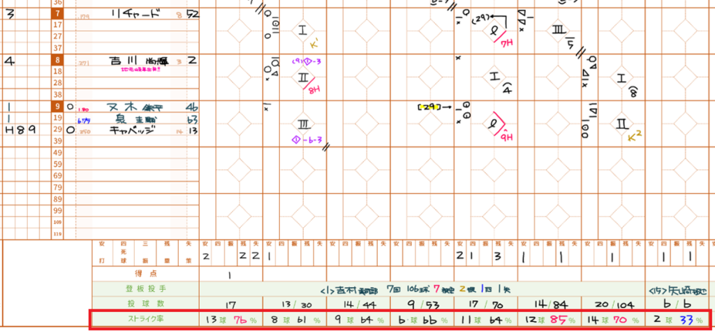 ストライク率が下がれば、おのずと投球数も増えることになりますから、ピッチャー交代のタイミングなどの試合展開も、感覚値ではなく的確に予測できるよにうになるのも、ストライク率をつける醍醐味と言えるでしょう。