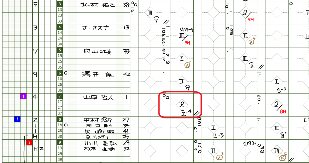 試合後にスコアを見るだけで、試合で起きた試合展開がつぶさに、しかも正確に振り返ることができるよう、しっかりと体系化されているのですね。こんな複雑なルールまでも記録に残せるように考えられている点も、スコアをつける一つの醍醐味と言えるでしょう。
