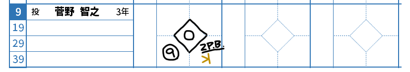 スコアパッド上は、菅野のリザルトのマスに振り逃げ三振を示す逆K」、さらに捕手による「捕逸(2PB)」を記載した上で、その周囲を囲ってホームに生還したラインが引かれるというものになります。